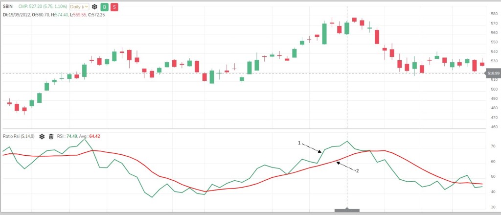 RSI = 100 – \left( \frac{100}{1 + RS} \right)