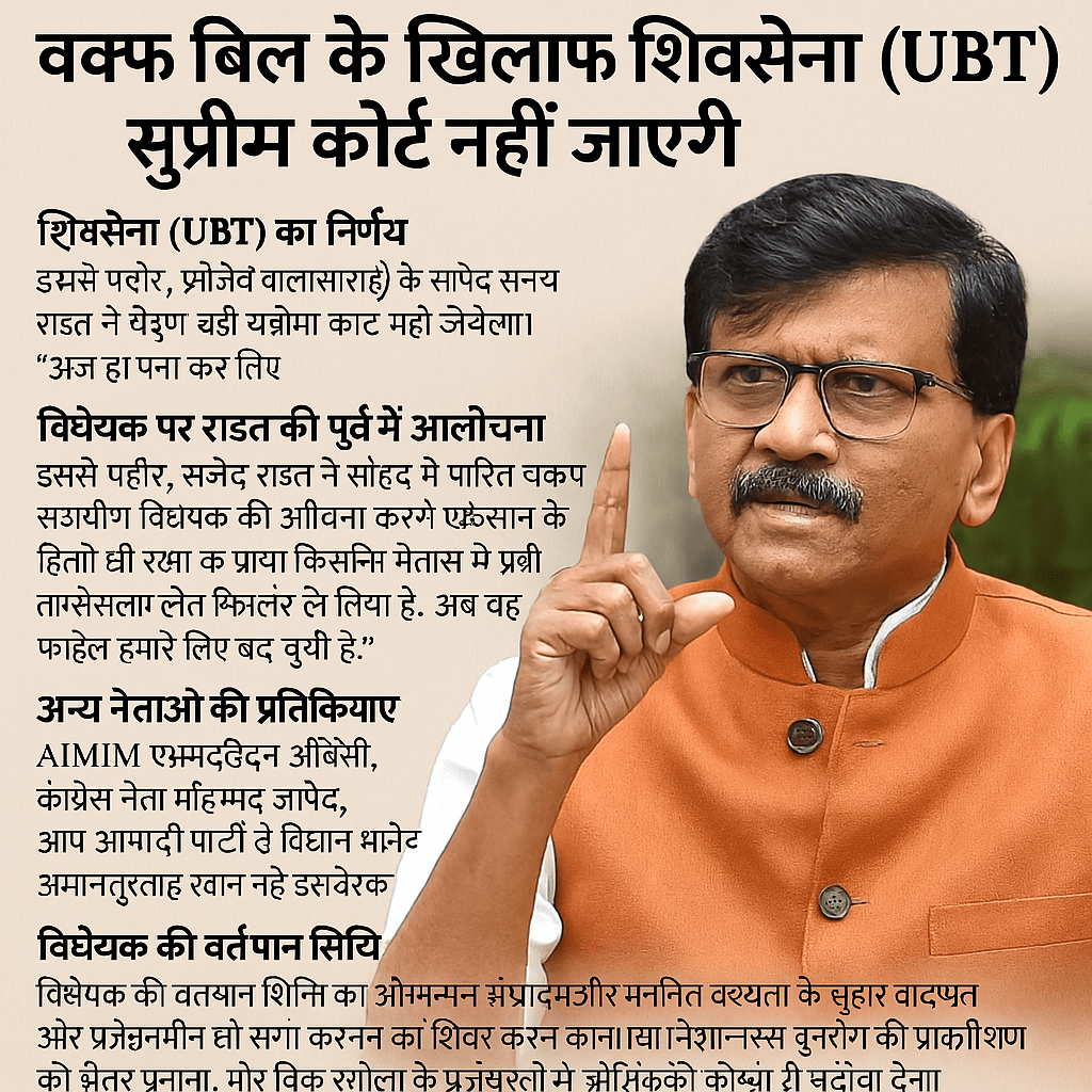 शिवसेना (उद्धव बालासाहेब ठाकरे) के वरिष्ठ नेता और सांसद संजय राउत ने स्पष्ट किया कि उनकी पार्टी अब वक्फ (संशोधन) विधेयक 2025 को लेकर सुप्रीम कोर्ट नहीं जाएगी। उन्होंने कहा: