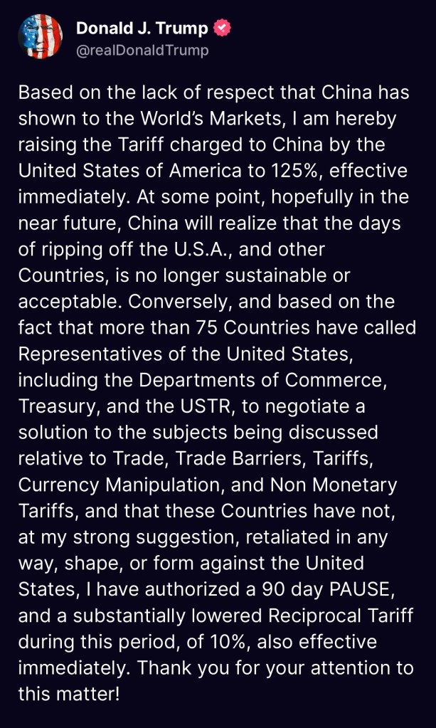 In a dramatic shift in U.S. trade policy, former President Donald Trump on April 9, 2025, announced a 90-day pause on increased tariffs for over 75 countries while simultaneously imposing a hefty 125% tariff on Chinese imports. The move has drawn widespread global attention and is already impacting financial markets and international relations.