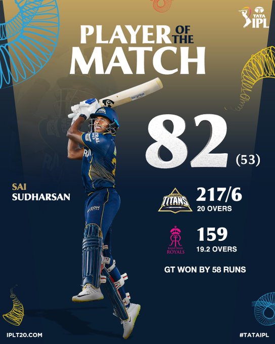 - Sai Sudharsan was deservedly named Player of the Match for his composed and aggressive batting display.
