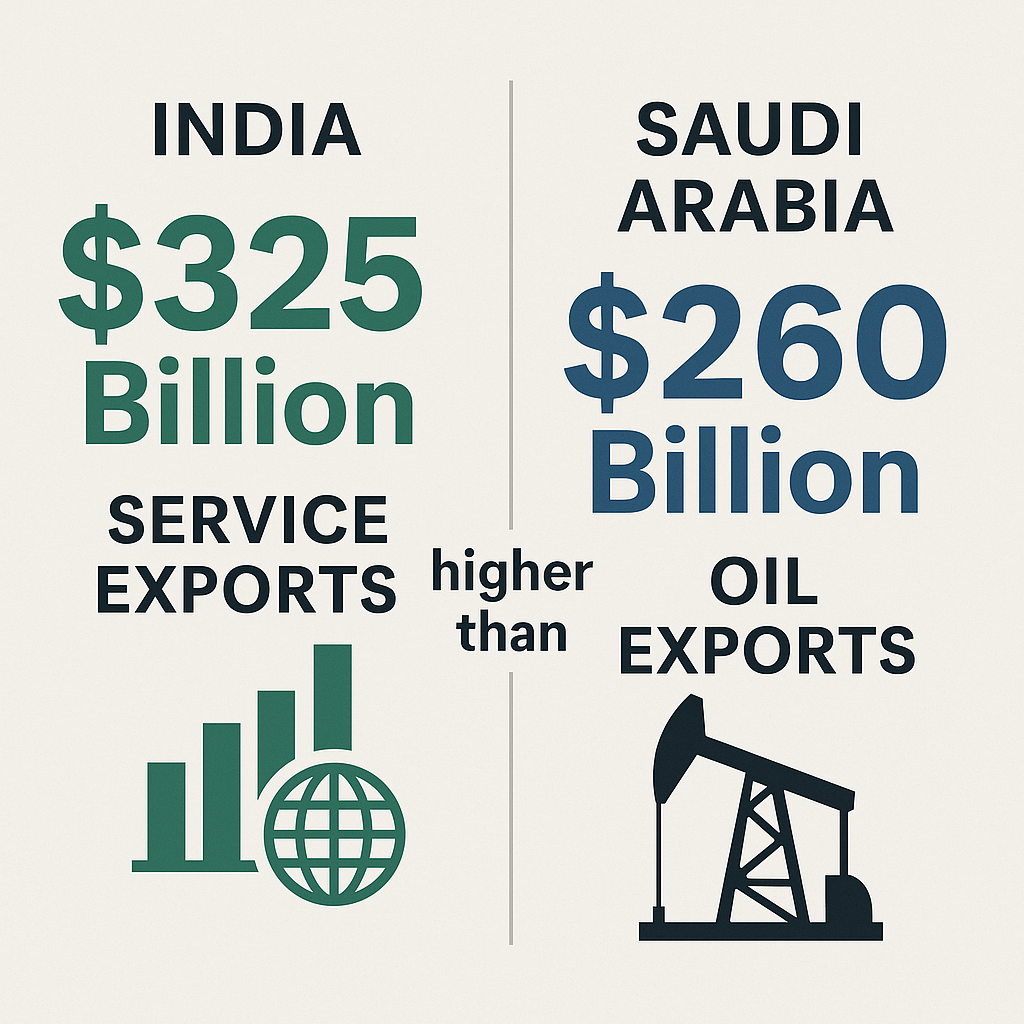विश्व व्यापार की बदलती तस्वीर के बीच, भारत का वार्षिक सेवा निर्यात वित्त वर्ष 2023–24 में लगभग $325 अरब तक पहुँच गया है, जो सऊदी अरब के कुल तेल निर्यात ($260 अरब) से अधिक है। यह तुलना वैश्विक अर्थव्यवस्था में हो रहे बदलावों की ओर संकेत करती है, जहाँ भारत एक ज्ञान आधारित और तकनीक संचालित अर्थव्यवस्था के रूप में उभर रहा है, जबकि सऊदी अरब अभी भी तेल पर निर्भर है।