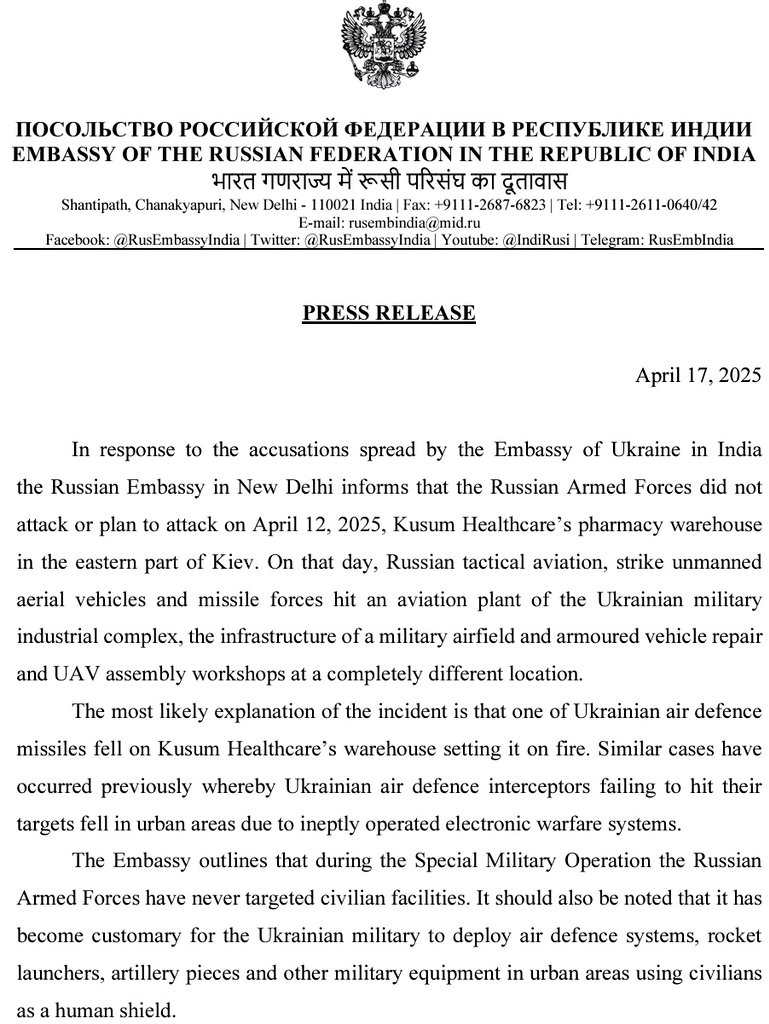रूसी दूतावास ने हाल ही में यूक्रेन की राजधानी कीव में भारतीय फार्मास्युटिकल कंपनी कुसुम हेल्थकेयर की एक फार्मेसी पर रूसी मिसाइल हमले के आरोपों को खारिज किया है। यूक्रेनी अधिकारियों का दावा है कि यह हमला जानबूझकर किया गया था, जिससे बच्चों और बुजुर्गों के लिए आवश्यक दवाएं नष्ट हो गईं। यूक्रेन में भारतीय दूतावास ने इस घटना पर चिंता व्यक्त की है और भारतीय नागरिकों की सुरक्षा सुनिश्चित करने के लिए कदम उठाए हैं।