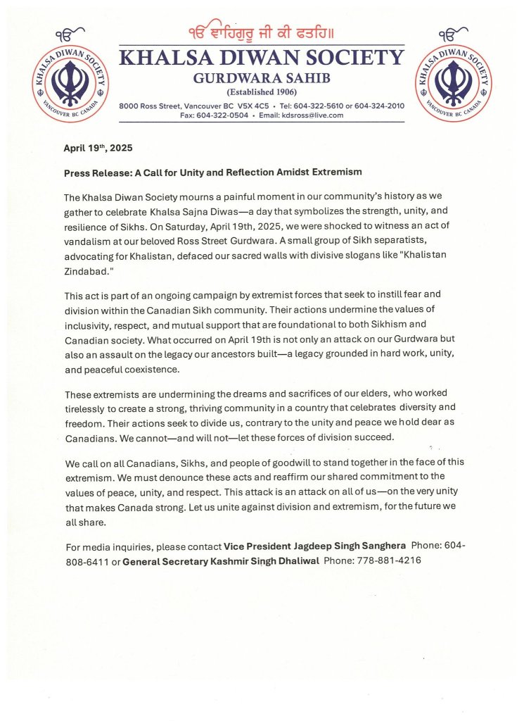 Khalsa Diwan Society Gurdwara, Vancouver statement ‘A small group of Sikh Separatists advocating for Khalistan defaces our sacred wall with divisive slogans’