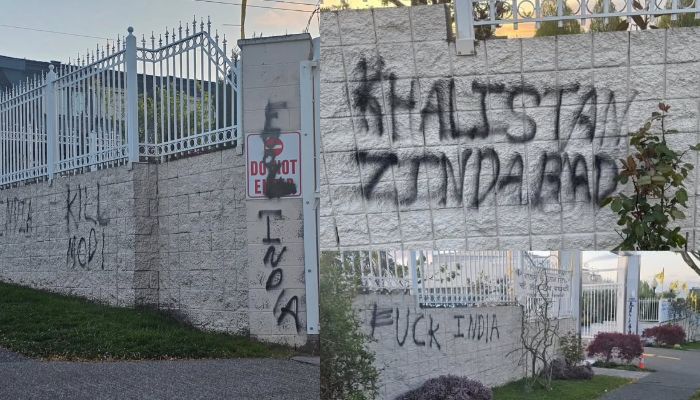 A defaced Gurdwara wall in Vancouver by Khalistani extremists: