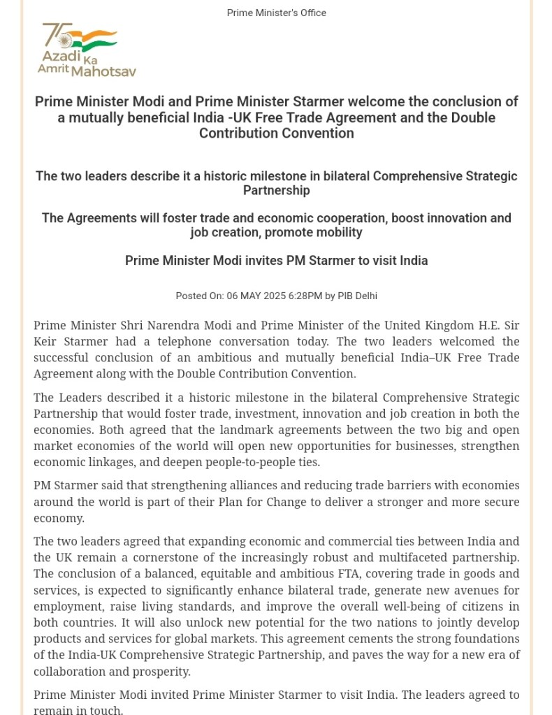 “यह समझौता हमारे व्यापक रणनीतिक साझेदारी को और गहरा करेगा, व्यापार, निवेश, विकास, रोजगार सृजन और नवाचार को उत्प्रेरित करेगा।” - यूके प्रधानमंत्री कीर स्टारमर: