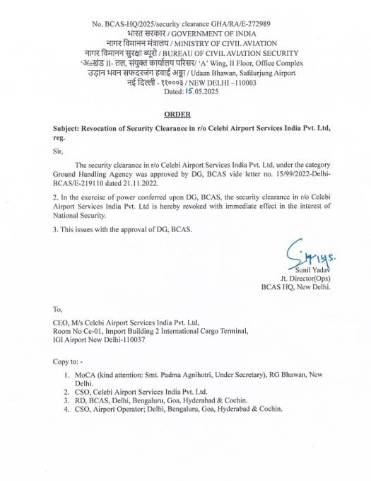 भारत सरकार ने राष्ट्रीय सुरक्षा को सर्वोपरि रखते हुए Celebi Airport Services India Pvt. Ltd. की सुरक्षा मंजूरी को तत्काल प्रभाव से रद्द कर दिया है। यह आदेश Bureau of Civil Aviation Security (BCAS) द्वारा 15 मई 2025 को जारी किया गया। आदेश में स्पष्ट रूप से उल्लेख है कि यह निर्णय “राष्ट्रीय सुरक्षा के हित में” लिया गया है।